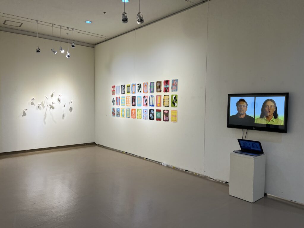 Durch die Montage an Metallgestängen lösen sich die Objekte von der Wand und treten in den Raum als einzelne, voneinander isolierte Einheiten. Diese räumliche Fragmentierung spiegelt die Logik des Gefalteten: Jede Skulptur ist Teil eines Kontinuums, ohne dieses vollständig zu repräsentieren. Wand, Träger und Objekt bilden ein relationales Gefüge, in dem sich Denken nicht abbildet, sondern räumlich artikuliert.